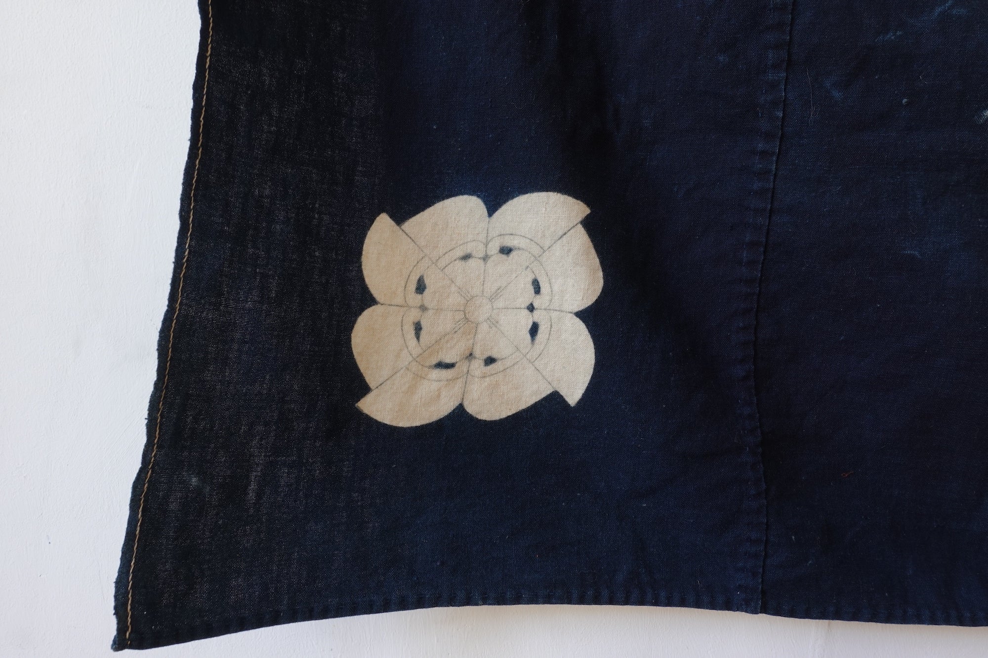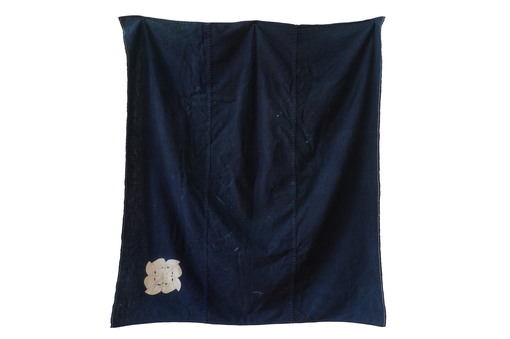 A deep indigo vintage furoshiki with a unique logo on one corner. The logo is based on traditional “Mokkou” family crest, which symbolizes a bird nest, and is reshaped as a windmill. Great vintage condition.
