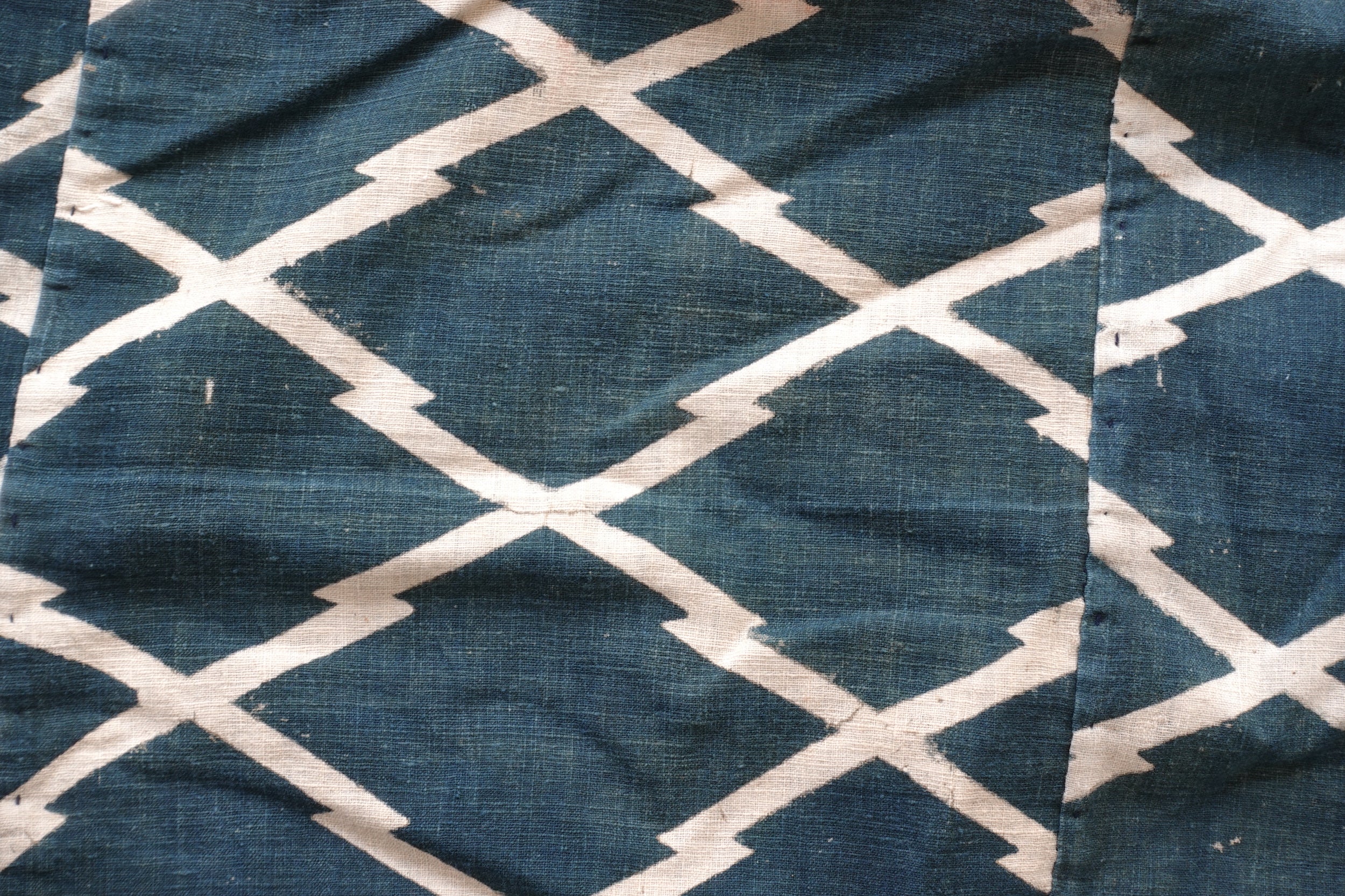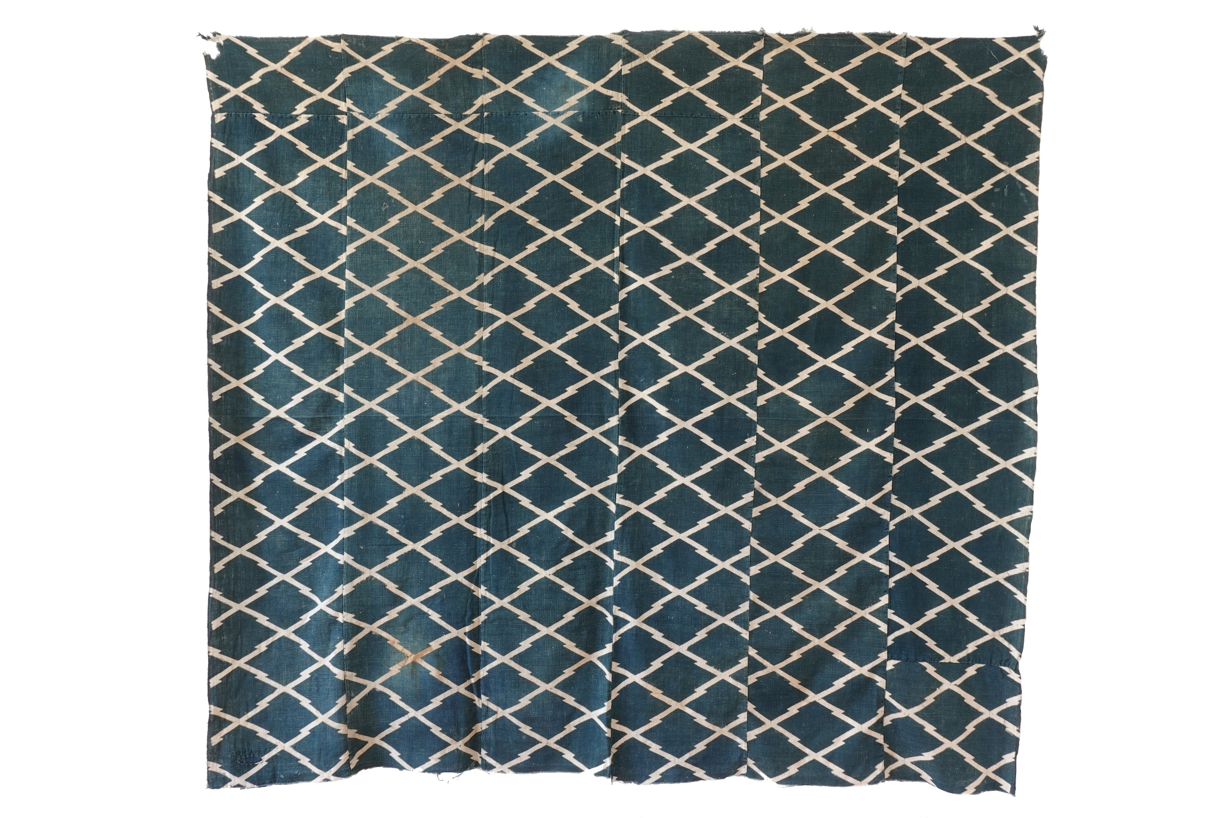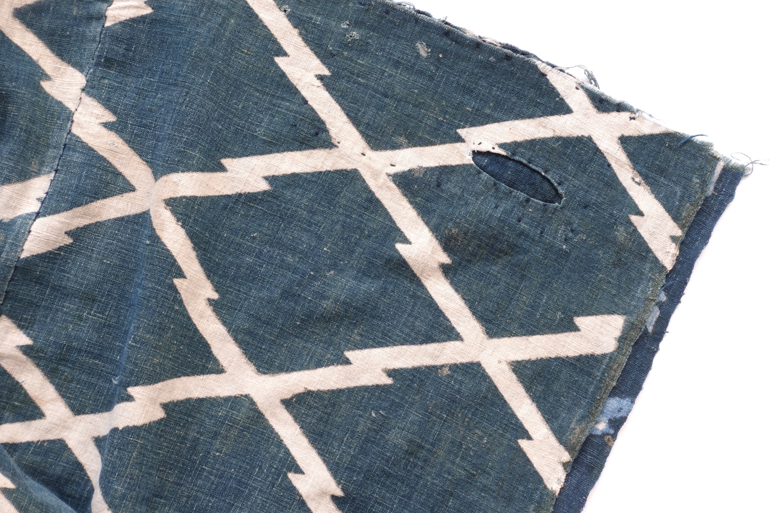 This exceptional fabric features the Matsubishi pattern, dyed in a vibrant green hue. Inspired by the cracks in pine tree bark, Matsubishi was a popular motif in late 16th-century Japan, often appearing in Noh costume embroidery, Makie lacquerware and Fusuma screen door. The design, a variation of the diamond motif (Hishimon), creates a striking nested pattern with smaller diamonds offset above and below.