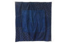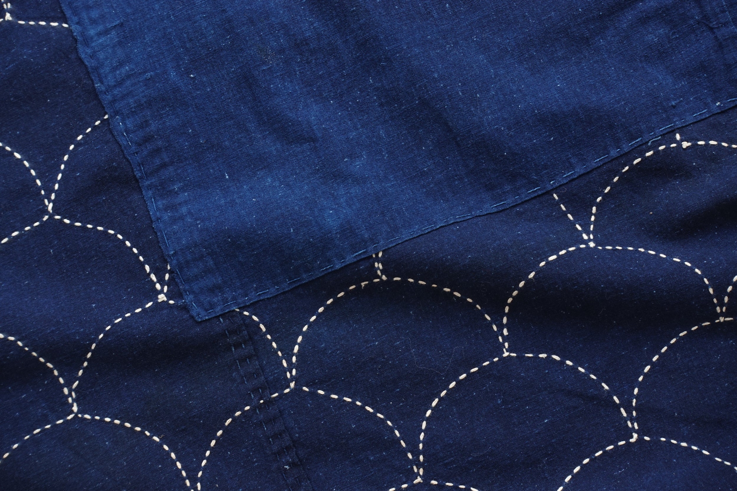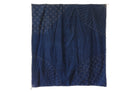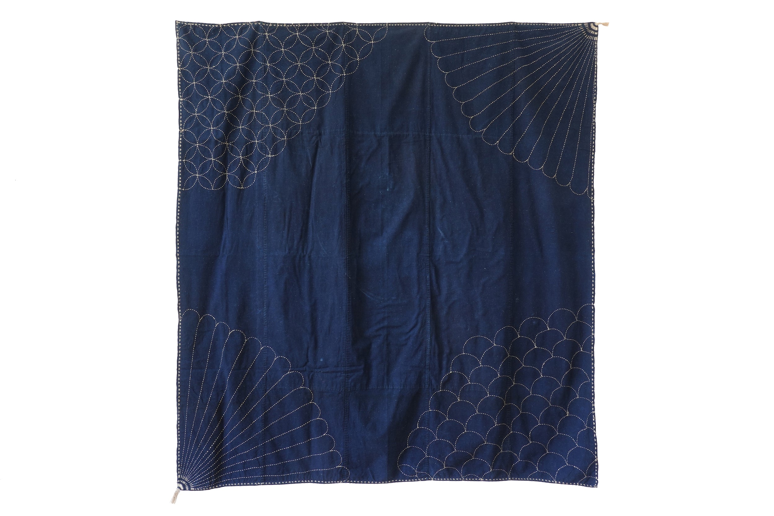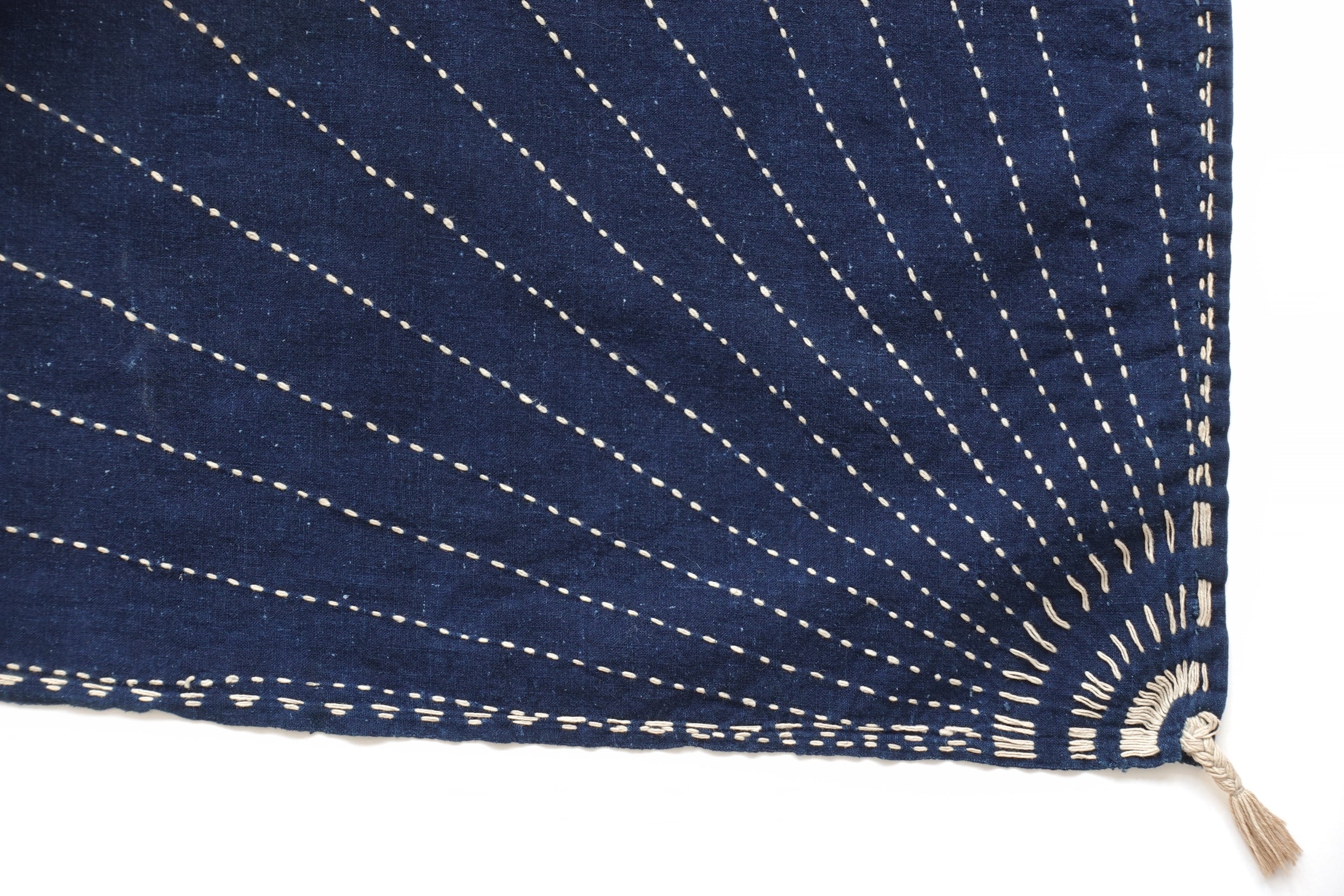The edges of the furoshiki are accented with stitching and adorned with short tassels on two corners, enhancing its unique character. A second layer of lighter indigo fabric, patched neatly at the center of the back, adds depth and durability.