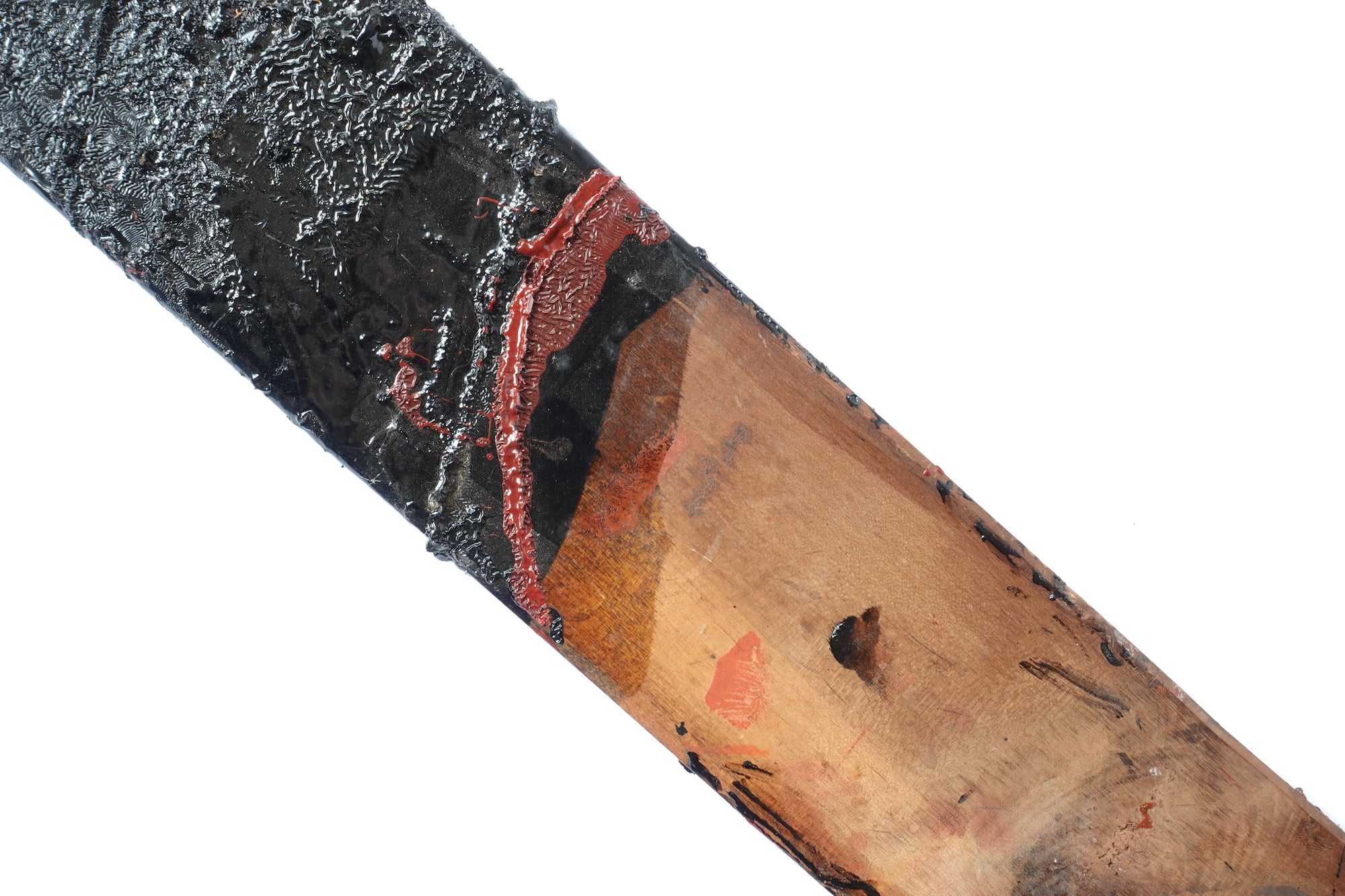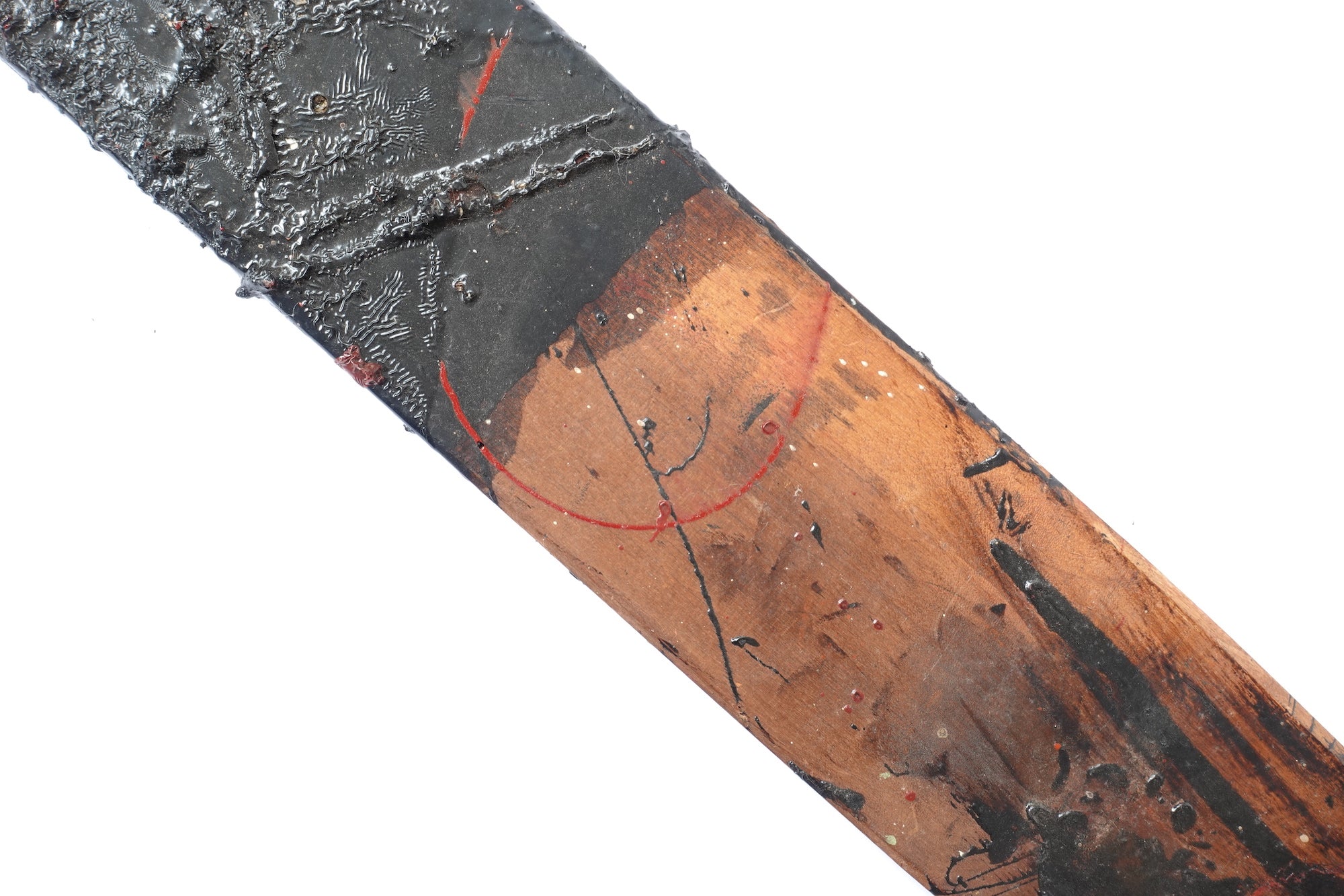 This exceptionally rare vintage wooden stick was used by urushi artisans to mix a bucket of lacquer. Salvaged from the Hokuriku region, one of the major areas in Japan known for centuries of lacquerware production, the stick may be as old as early 20th century and was in use for many decades. It has multiple layers of dried lacquer and patina, with the unique aura and accidental beauty of tactile tools. The mixing stick shares a powerful aesthetic also found in some abstract paintings by artists from post-war Japan.  A great addition for the wall in a modern style interior.