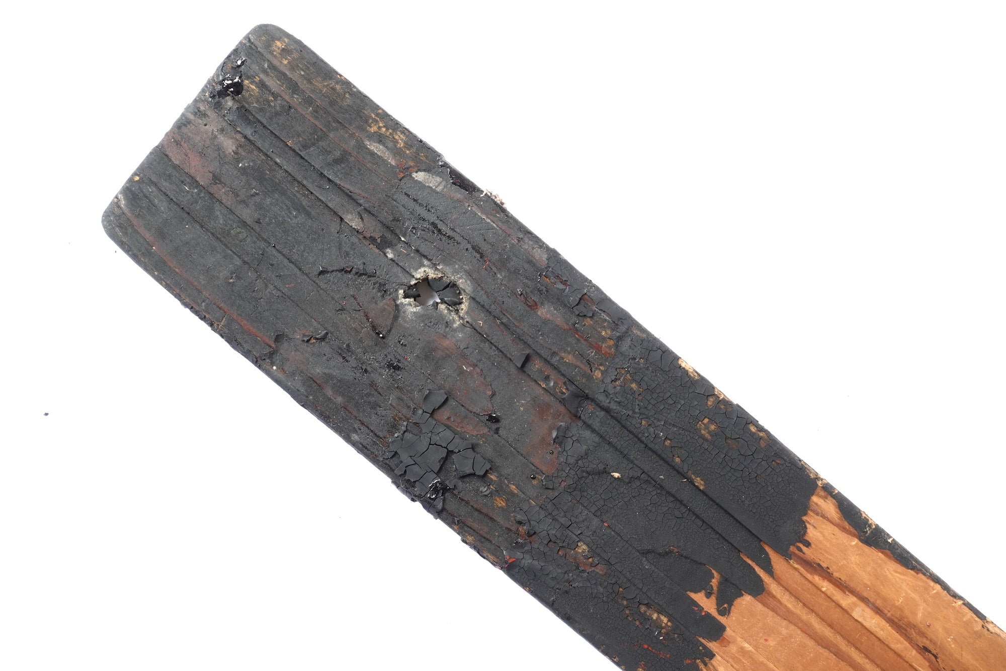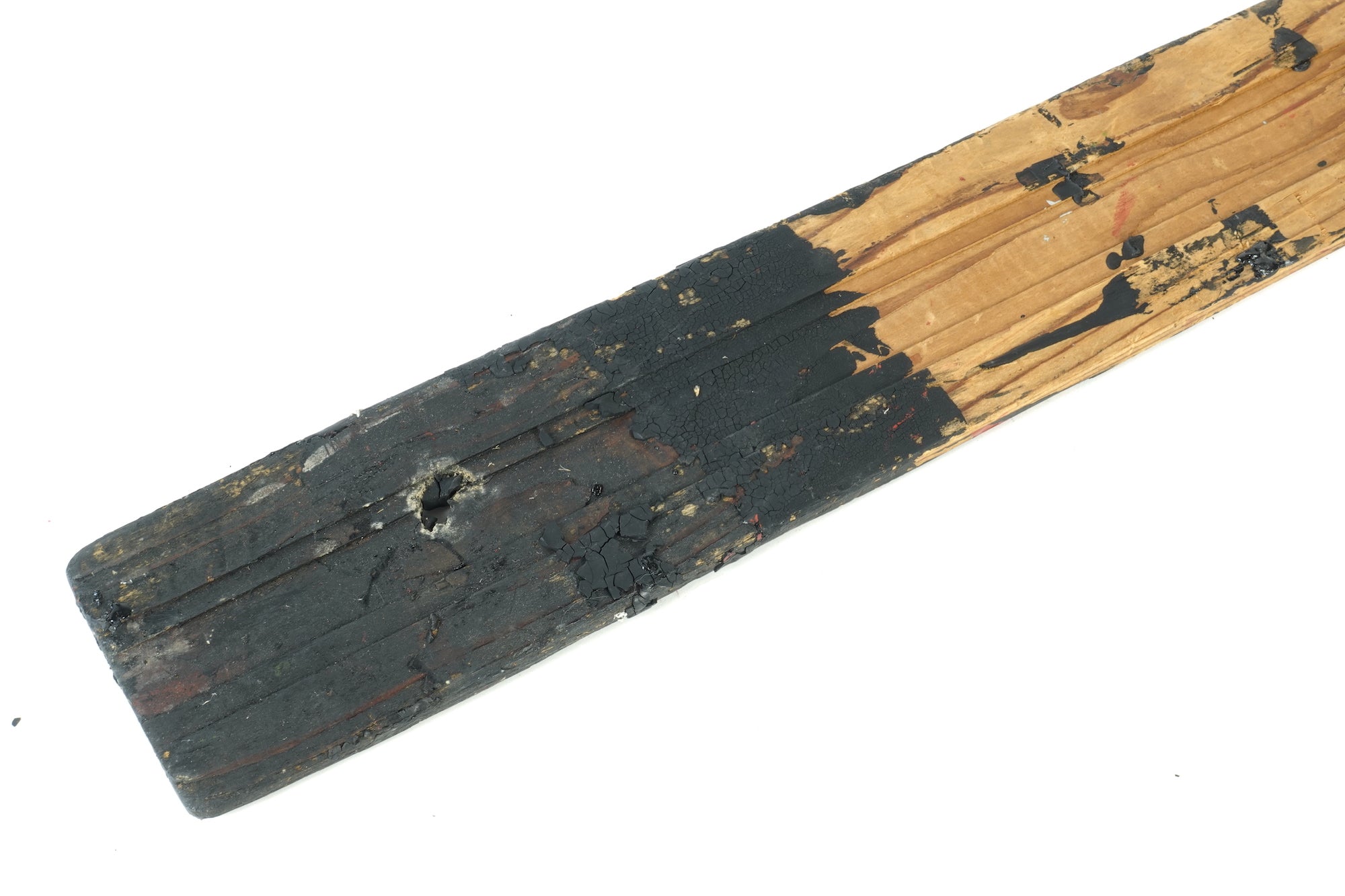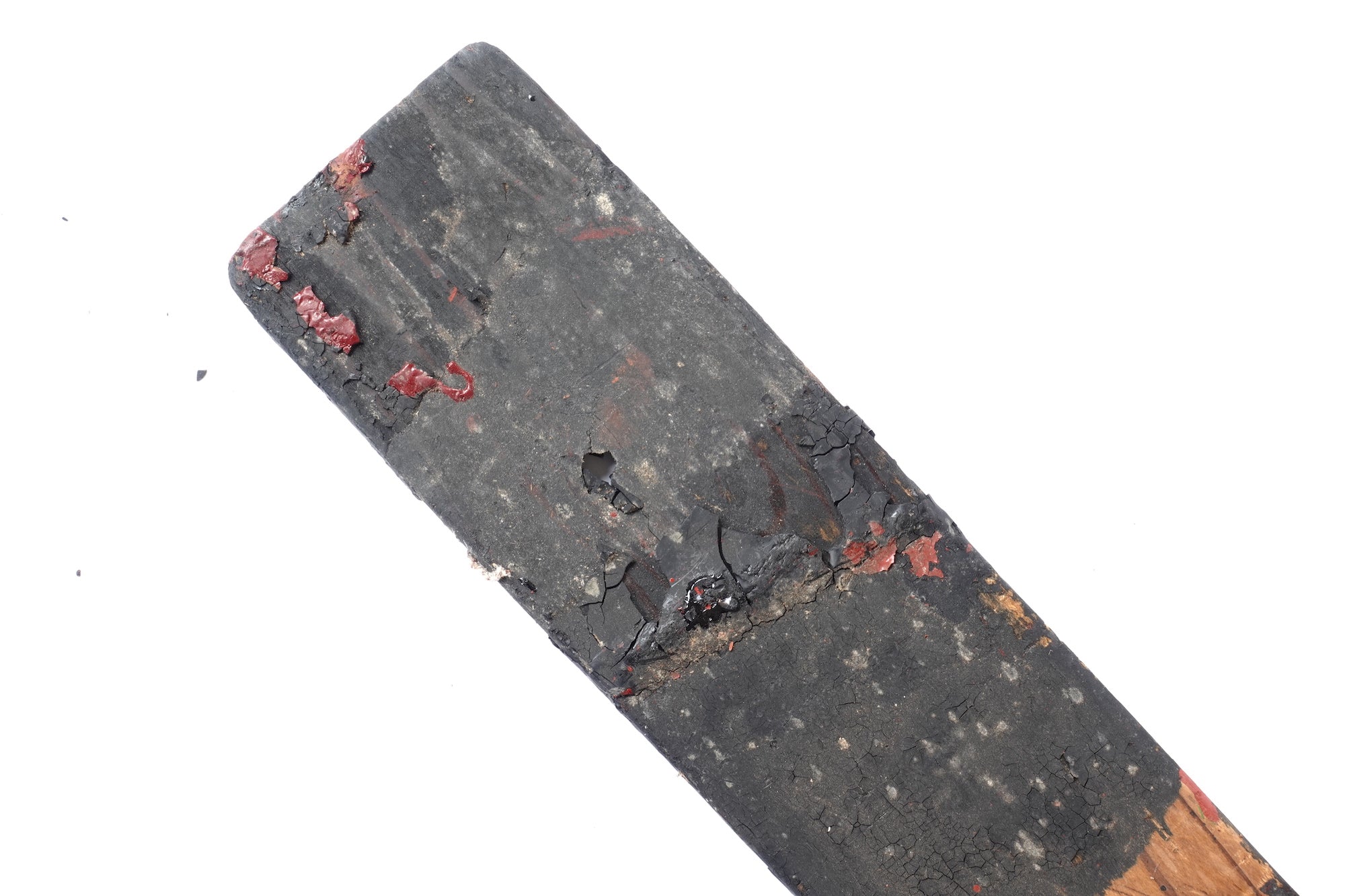 This exceptionally rare vintage wooden stick was used by urushi artisans to mix a bucket of lacquer. Salvaged from the Hokuriku region, one of the major areas in Japan known for centuries of lacquerware production, the stick may be as old as early 20th century and was in use for many decades. It has multiple layers of dried lacquer and patina, with the unique aura and accidental beauty of tactile tools. The mixing stick shares a powerful aesthetic also found in some abstract paintings by artists from post-war Japan.  A great addition for the wall in a modern style interior.