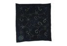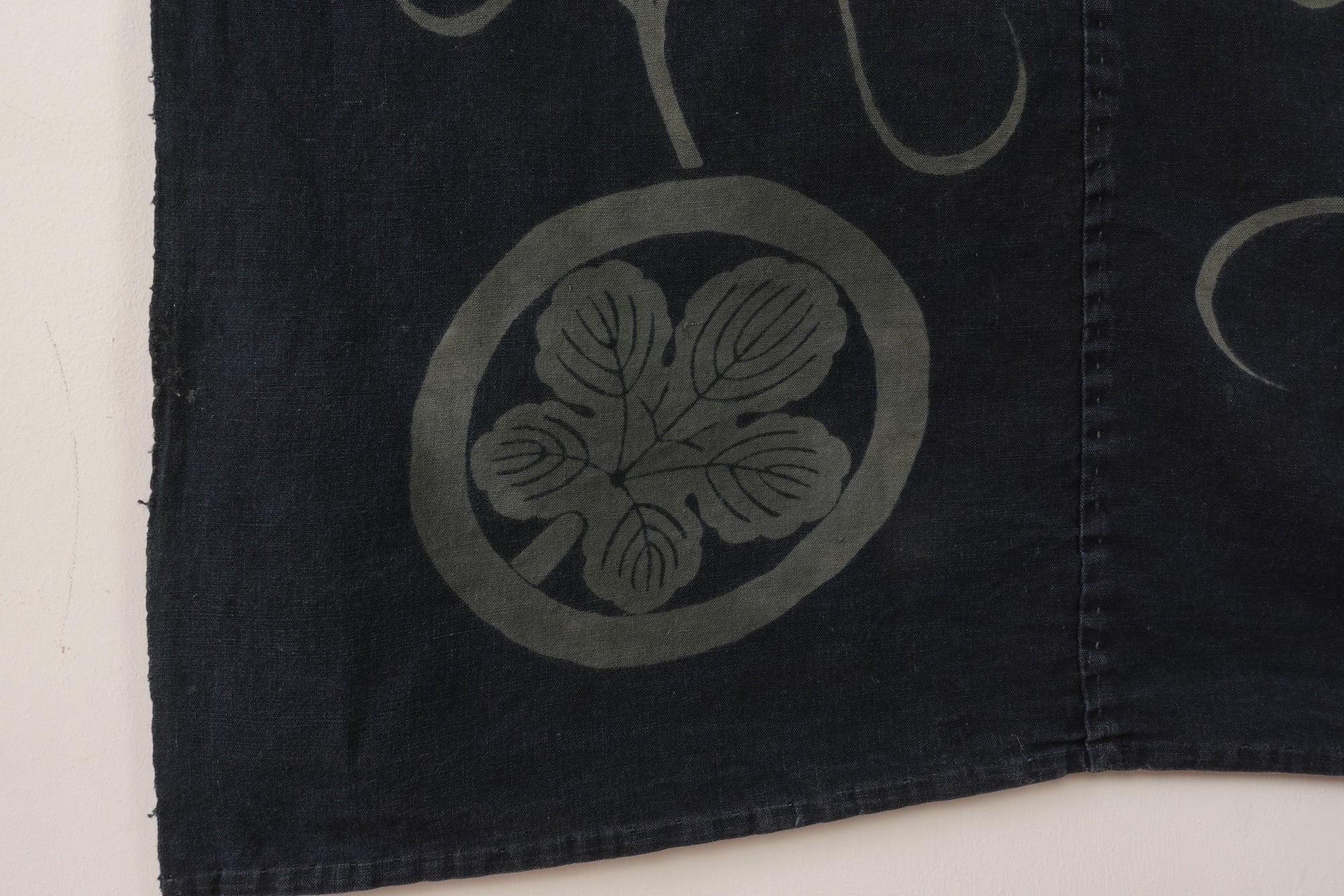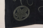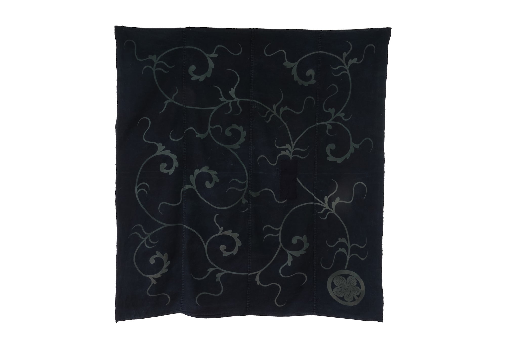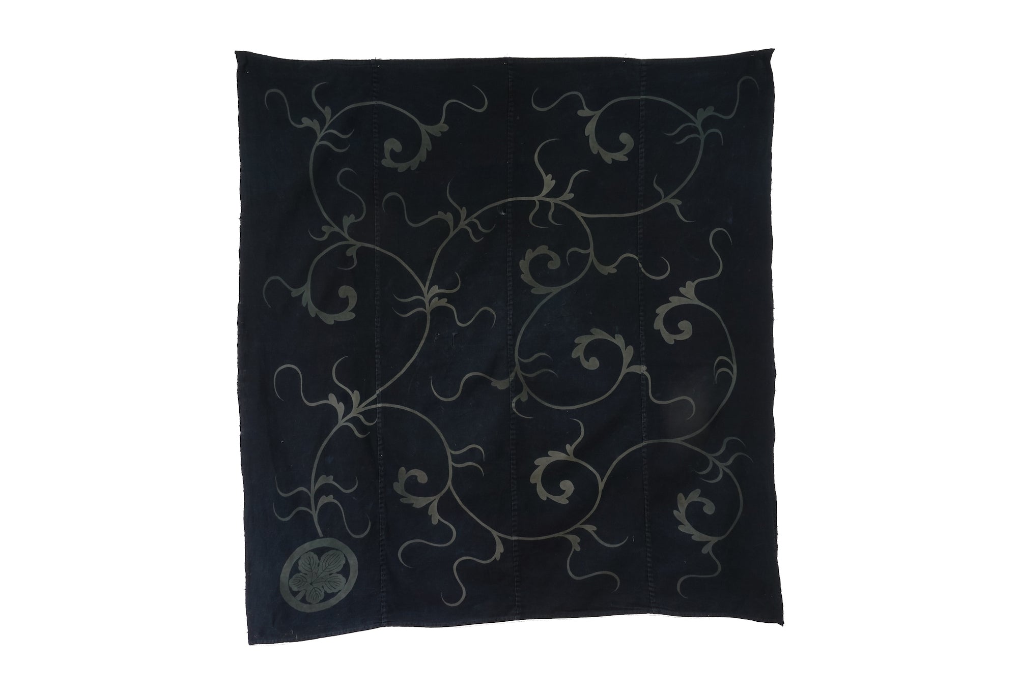 This furoshiki is made from four cotton fabric panels of extra deep indigo. It is hand-stitched with sashiko thread and bears prints of karakusa (Japanese arabesque) pattern and a kamon called “Kajinoha(梶の葉),” or symbol of Mulberry Leaf, dyed in grey.